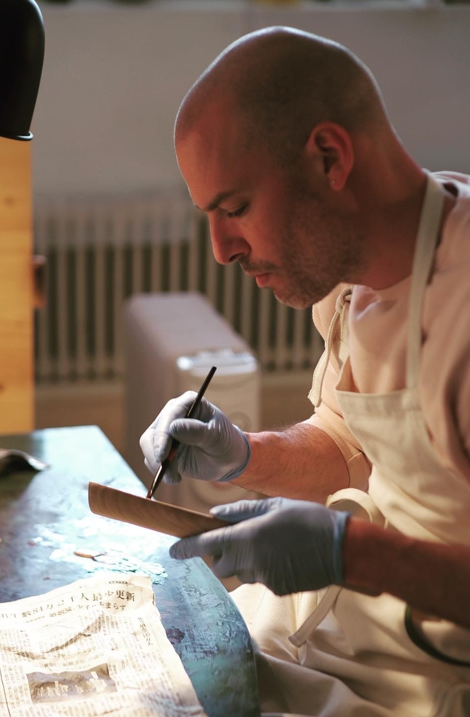 Lors de mon voyage suivant au Japon, je suis allé spécifiquement à la recherche de pièces urushi. Tenir une pièce entre mes mains, de manière consciente pour la première fois, a été saisissant. À cet instant, j’ai su immédiatement que je voulais apprendre à appliquer cette laque moi-même.
