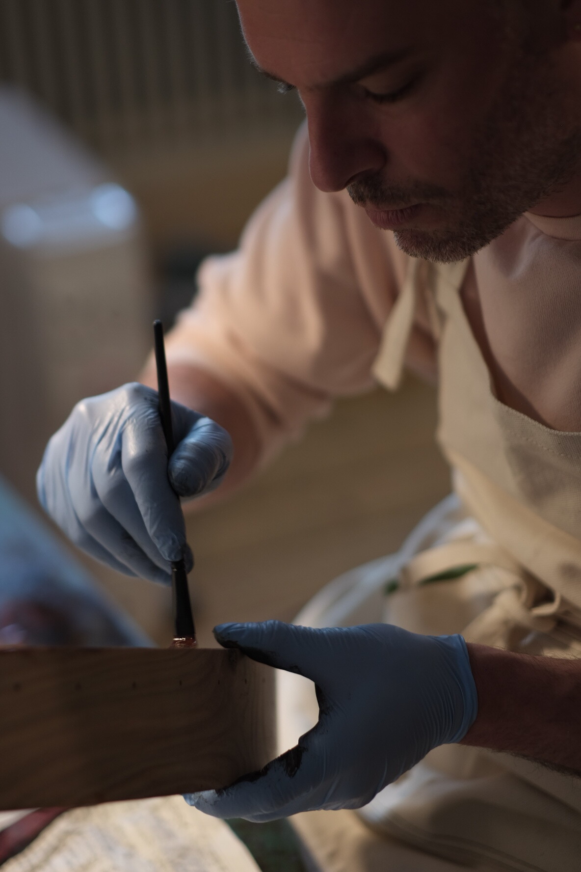 J’ai commencé à travailler avec le matériau que je connaissais le mieux grâce à mon apprentissage de polymécanicien : différents métaux. Mais très vite, j’ai développé un fort intérêt pour le bois. Ayant déjà voyagé plusieurs fois au Japon, je connaissais l’urushi, mais cela me semblait totalement inaccessible. L’idée m’est revenue en cherchant un moyen d’étanchéifier des tasses que j’avais fabriquées.