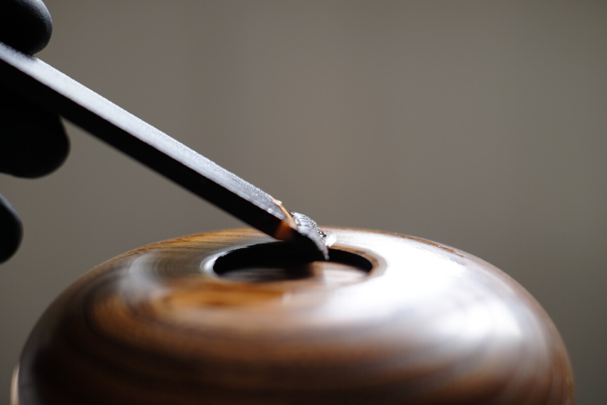 Technique Fuki-Urushi : méthode plus simple où l’urushi est essuyé, laissant une couche très fine qui met en valeur le grain naturel du bois.