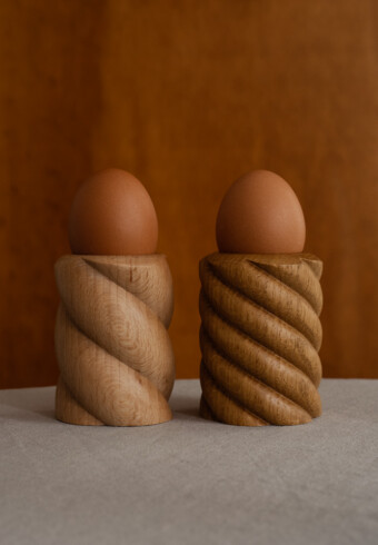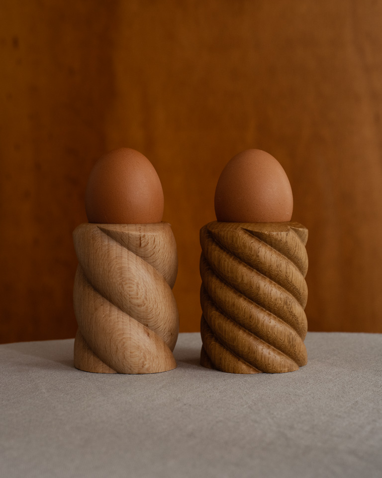 Les coquetiers Torsade s’inspirent des pieds du mobilier du XVIIe siècle. Dans un registre ornemental, tout en restant très sculptural et minimal, ils apportent une touche intemporelle à la table. Leur vernis alimentaire mat en feront des objets durables.