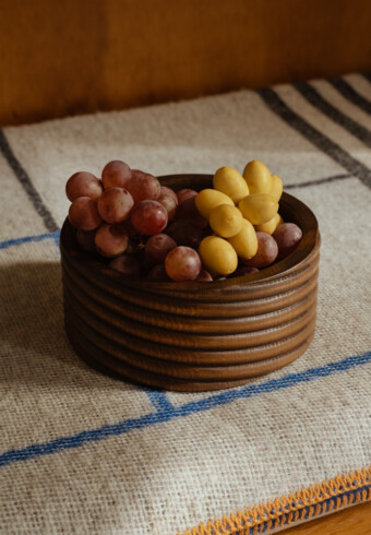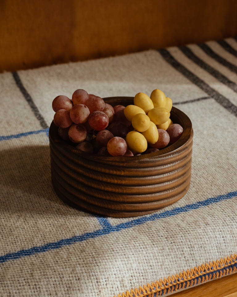 Le grand récipient Torsade se prête aussi bien à l’usage de corbeille à fruits qu’à celui de saladier. Empilable, il allie esthétique sculpturale et fonctionnalité. Conçu en bois de hêtre certifié FSC et teinté au brou de noix, il révèle une teinte foncée et chaleureuse. Protégé par un vernis alimentaire, il est pensé pour être le plus intemporel et durable possible.