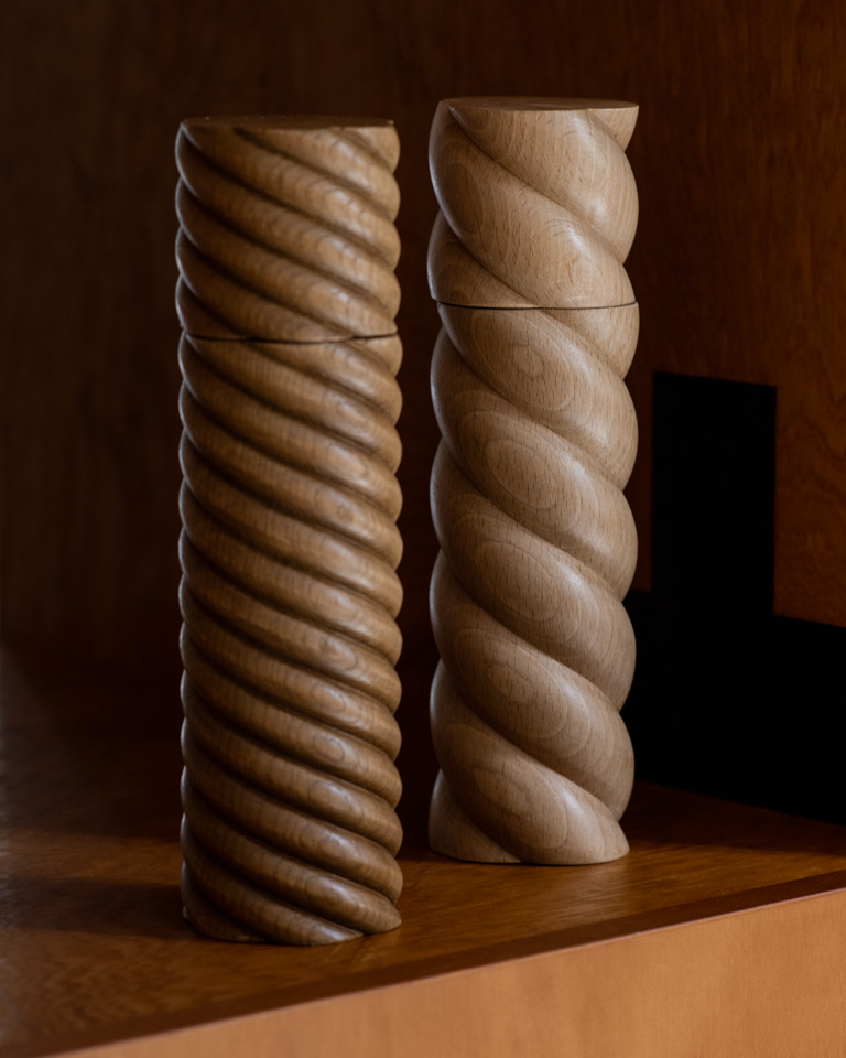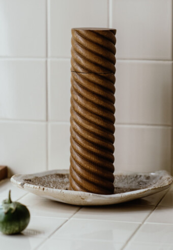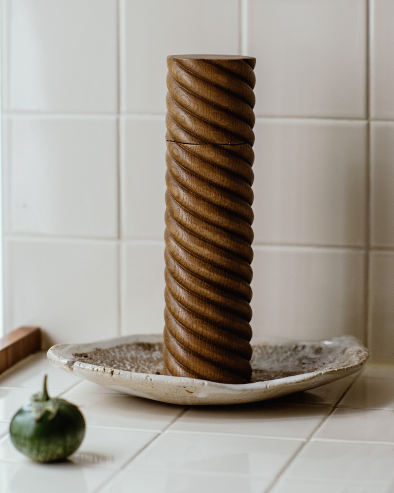 Le moulin à poivre Torsade se distingue par sa forme sculpturale et hypnotisante. Doté d’un mécanisme réglable CrushGrind® en céramique, il permet de moudre poivre, sel, herbes et autres épices. Pour le remplir, il suffit de tirer le bouchon vers le haut, dévoilant une ouverture pour verser les épices. Travaillé dans un bois de chêne certifié FSC et protégé par un vernis alimentaire, il a été pensé pour être le plus intemporel et durable possible.