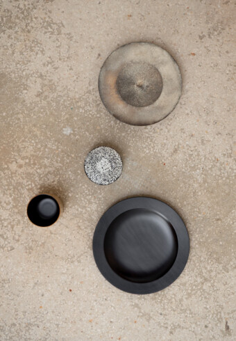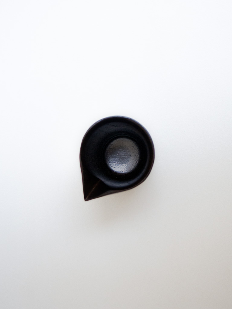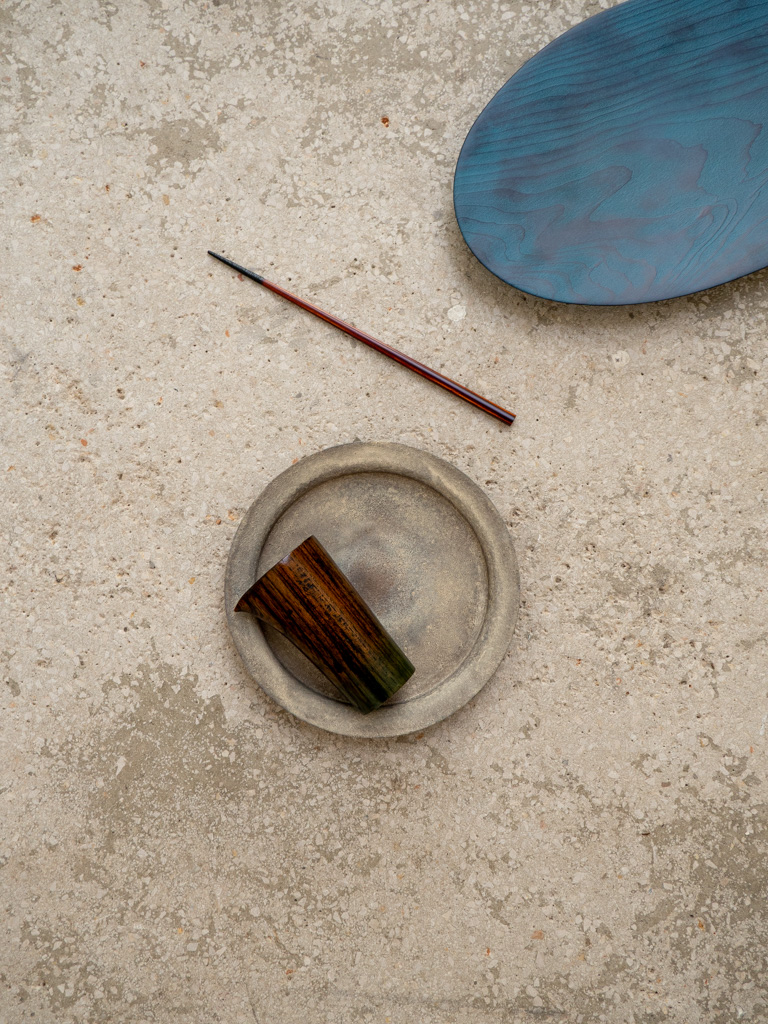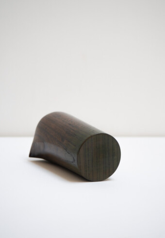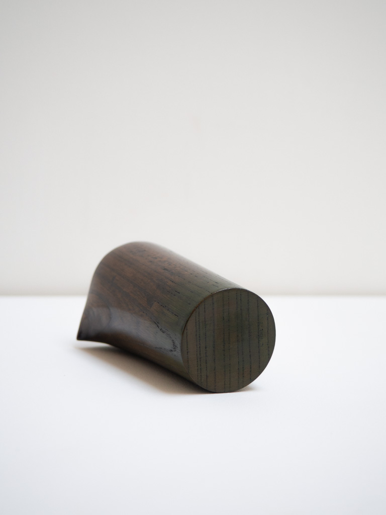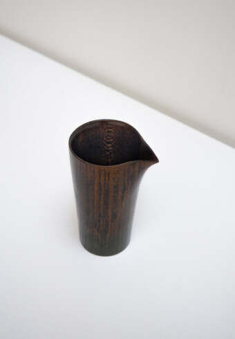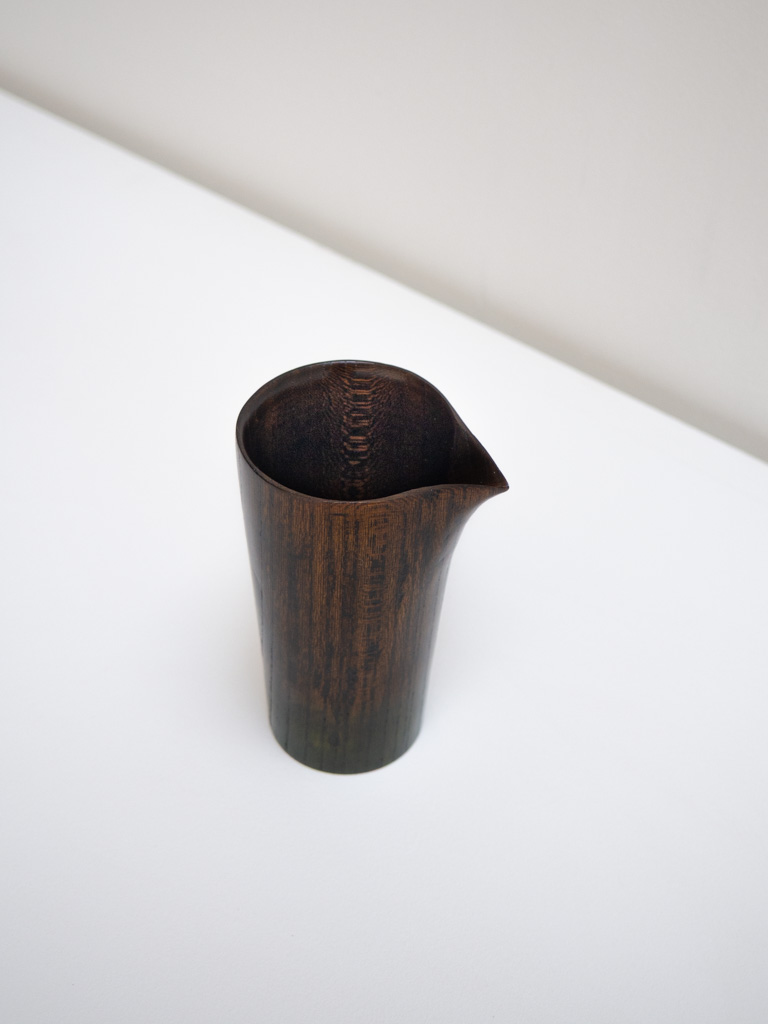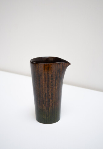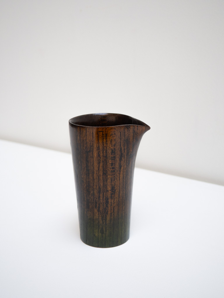 De son nom traditionnel « Katakuchi », ce récipient à bec est habituellement utilisé pour servir le saké au Japon. L’extérieur a été travaillé à l’aide de la technique Fuki-urushi, associée au Bokashi-nuri (laque en dégradé), où le passage du vert au brun est créé dès la première application de laque.