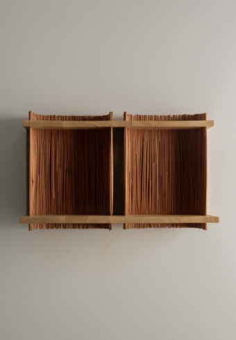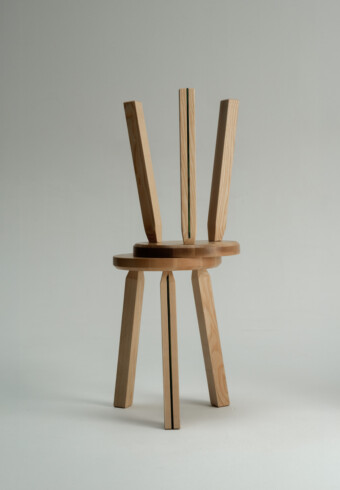 Ce tabouret bas s’inspire des tabourets tripodes traditionnellement utilisés dans les milieux ruraux. La paille de seigle teintée vient trouver refuge sur les pieds et l’assise, faisant un clin d’oeil à la marqueterie de paille et au coin qui peut venir renforcer le tenon des pieds.