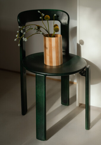 Ce vase cylindrique célèbre les lignes graphiques et le contraste des essences. En érable et merisier, il a d’abord été assemblé puis tourné par Coralie Le Borgne à Lyon (France) et protégé par de l’huile dure. Vendu avec un vase en verre à glisser à l’intérieur.